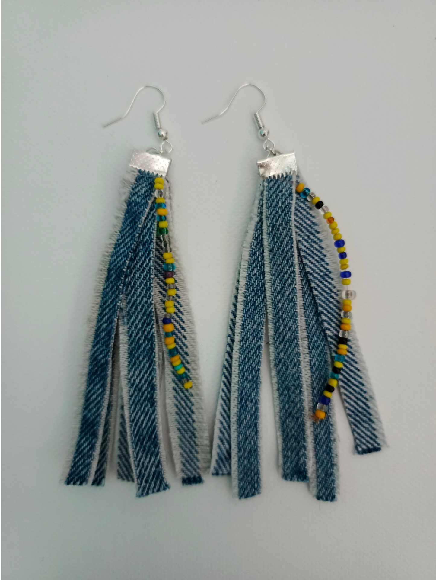 „Dopřejte svému outfitu kapku rebelské elegance. Tyto originální náušnice jsou ručně ušity z jemně roztřepených proužků upcyklované džínoviny, které jim dodávají pohyb a lehkost. Každý pár je doplněn o šňůrku pestrobarevných korálků, které rozzáří vaši tvář a dodají šperku jedinečný charakter.
