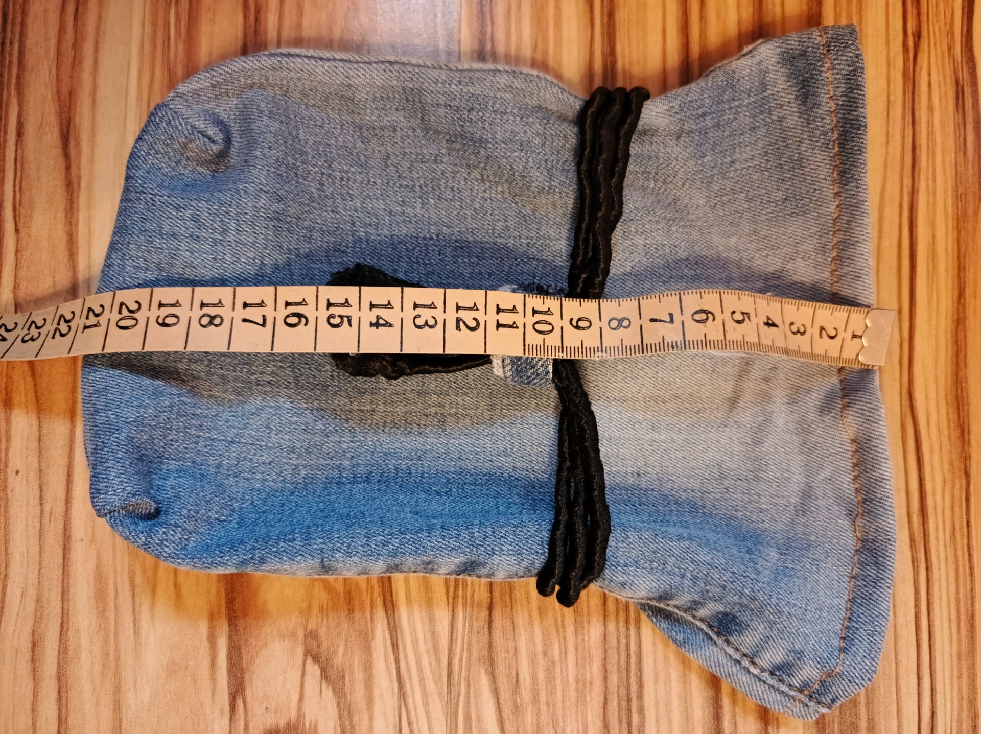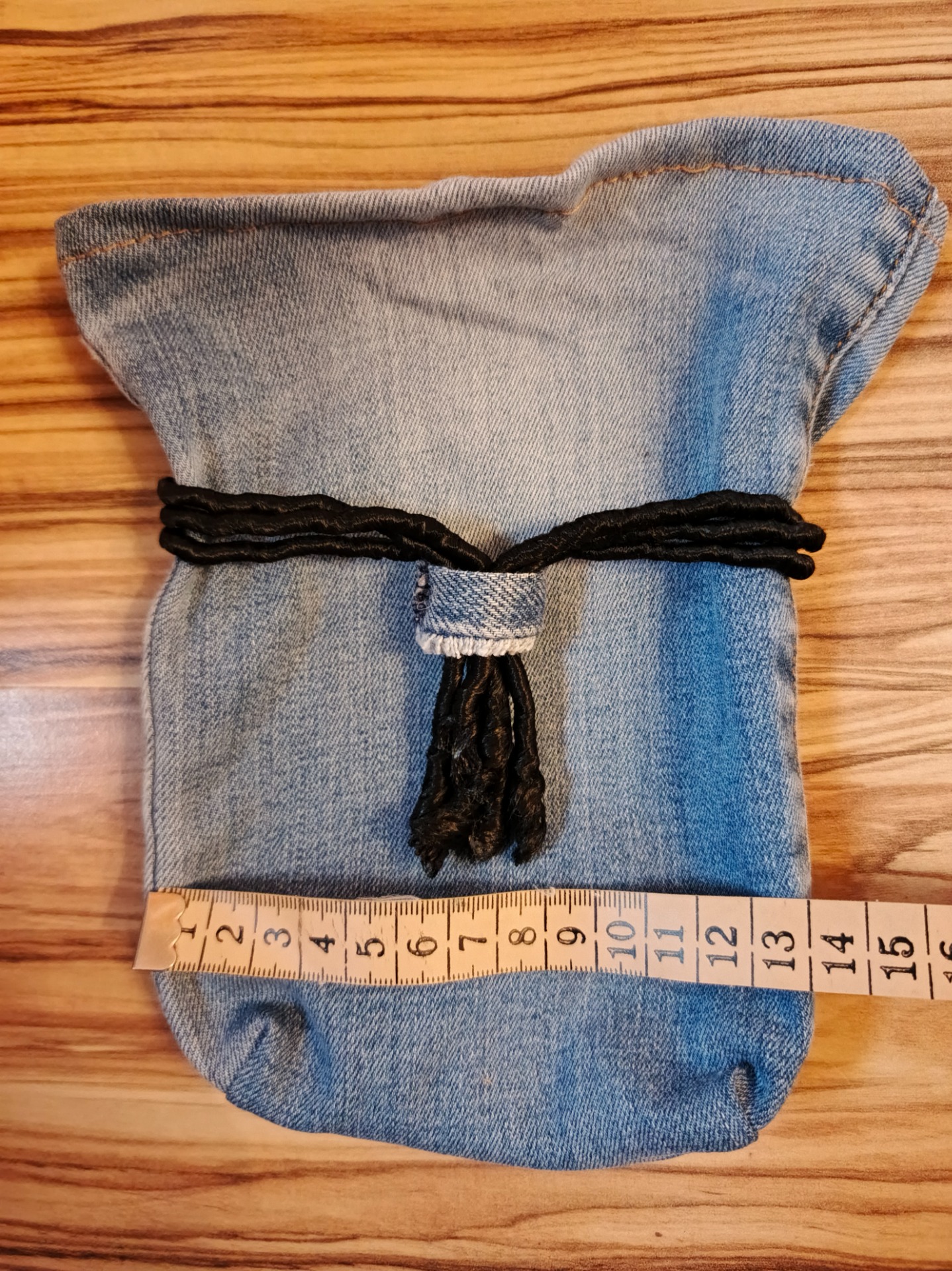 Materiál: Upcyklovaný denim, textilní šňůrky, dřevěná/plastová rulička od nití.