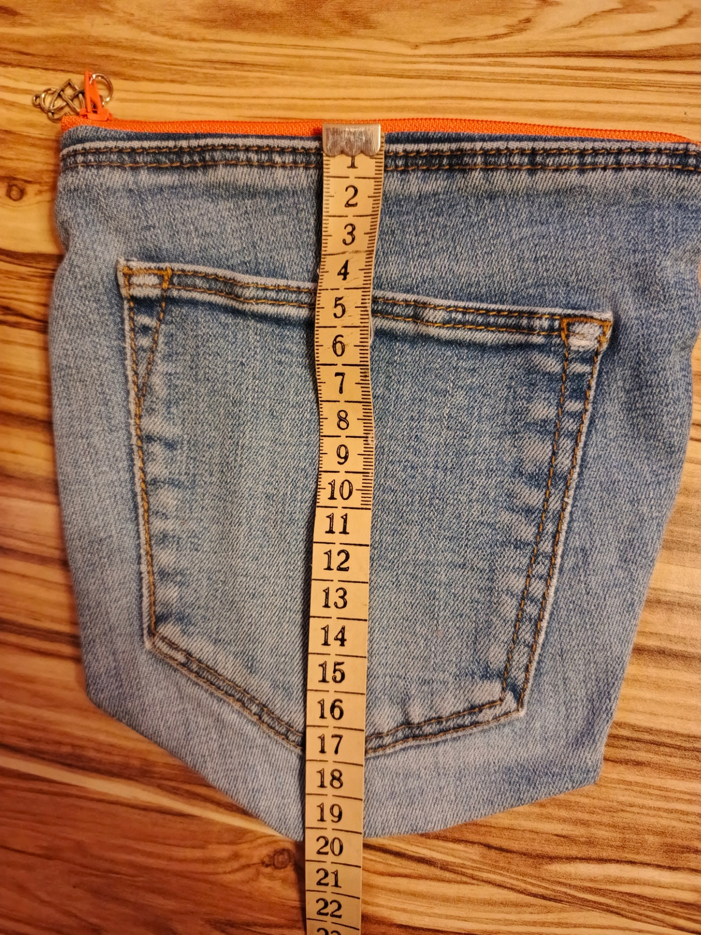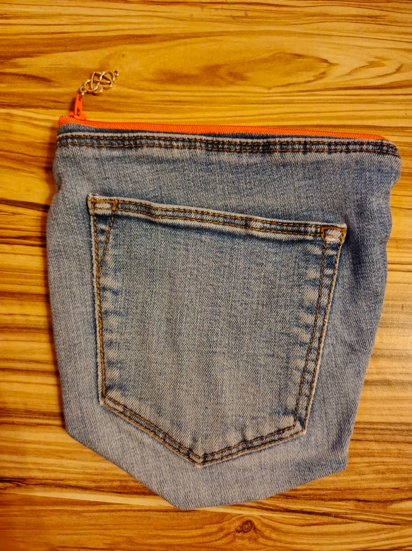 Materiál: Upcyklovaný denim, bavlna (podšívka), kovový přívěsek.
