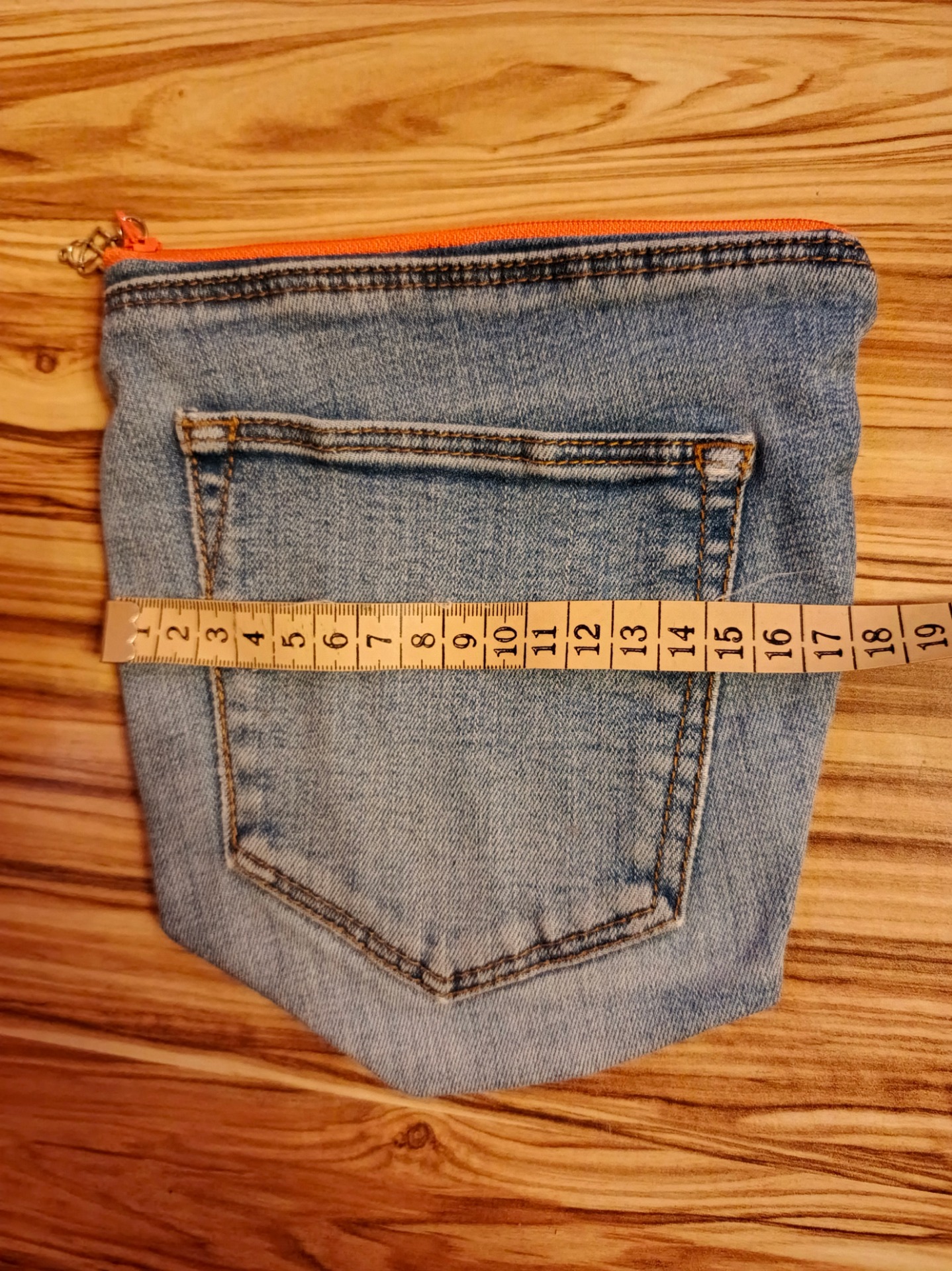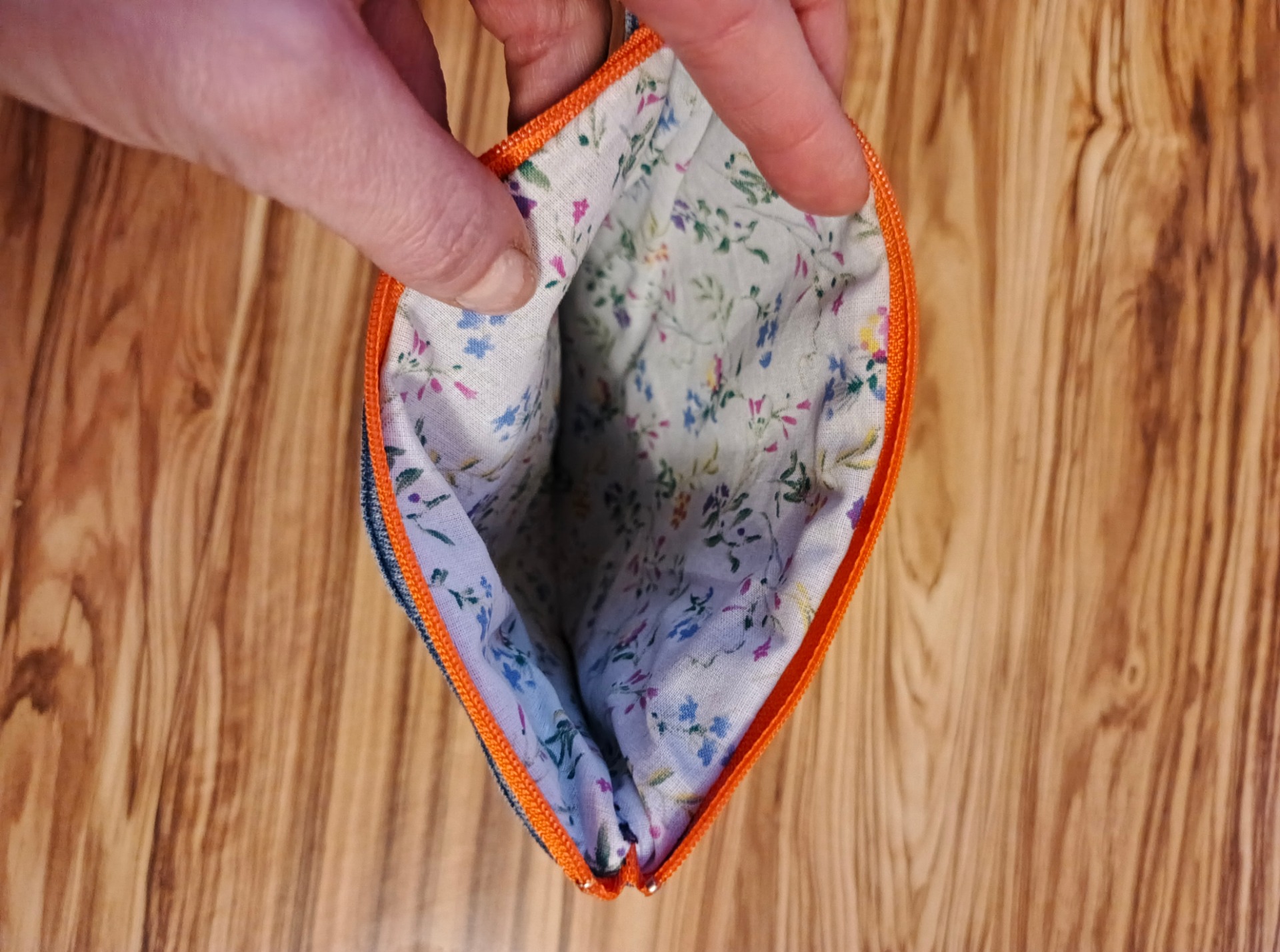 Vnější strana si zachovává funkční vzhled džínové kapsy, zatímco vnitřek vás překvapí jemným květinovým motivem.„Tato džínová taštička je ideální jako organizér do kabelky pro každou ženu, která miluje handmade doplňky a udržitelnou módu.“