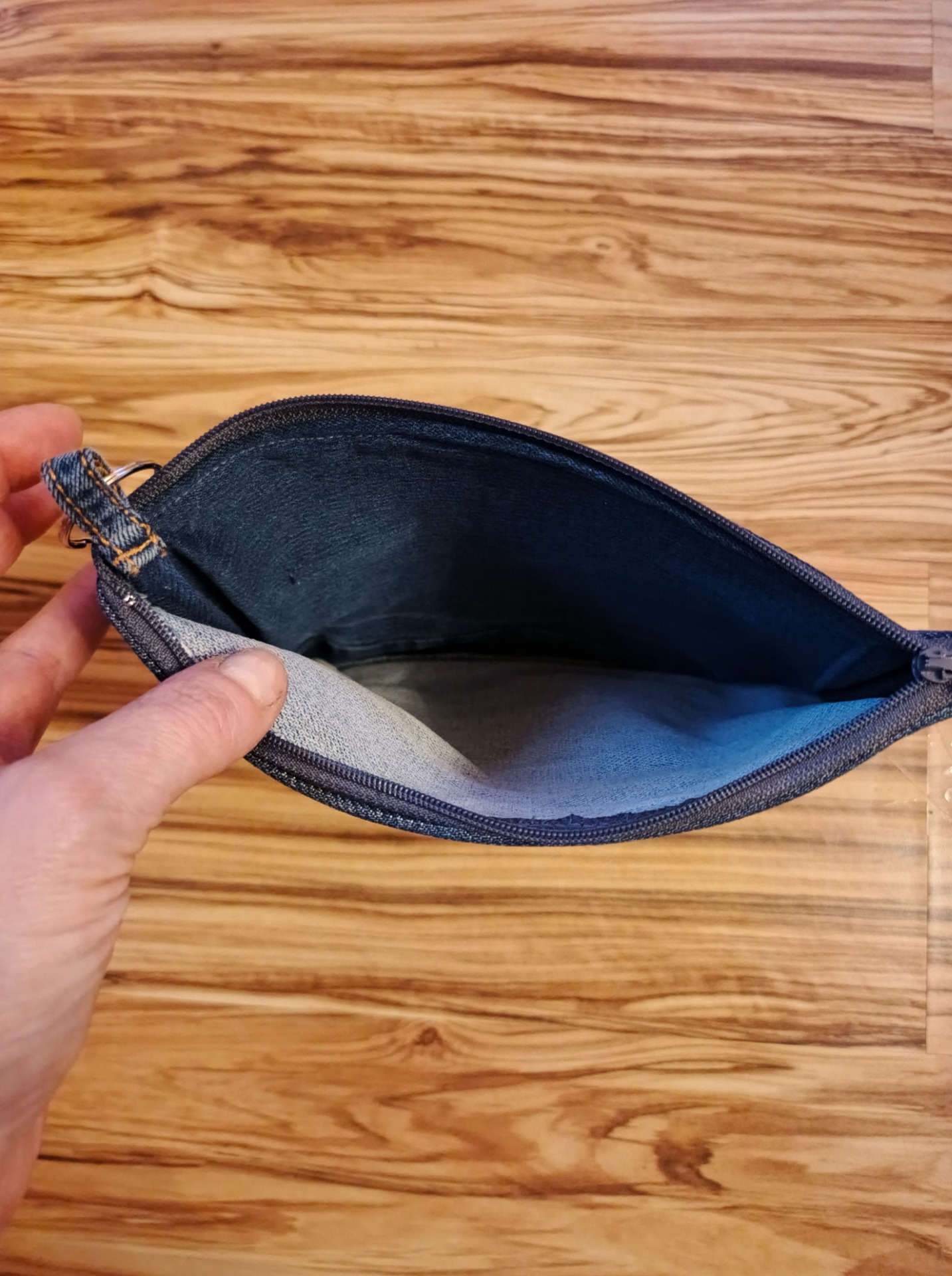 Originální patchwork: Kombinace světlého a tmavého denimu dělá z každé taštičky neopakovatelný kousek.