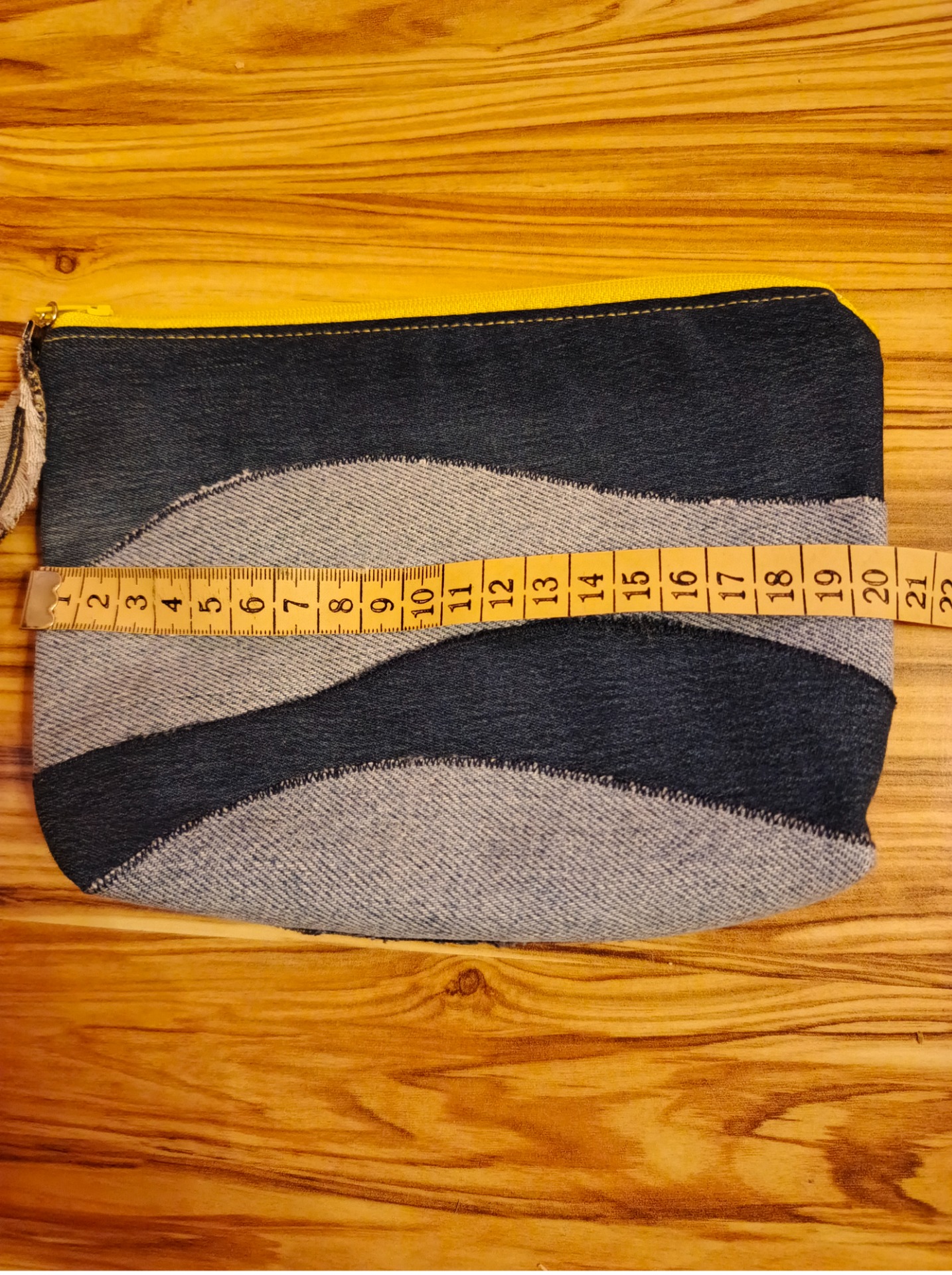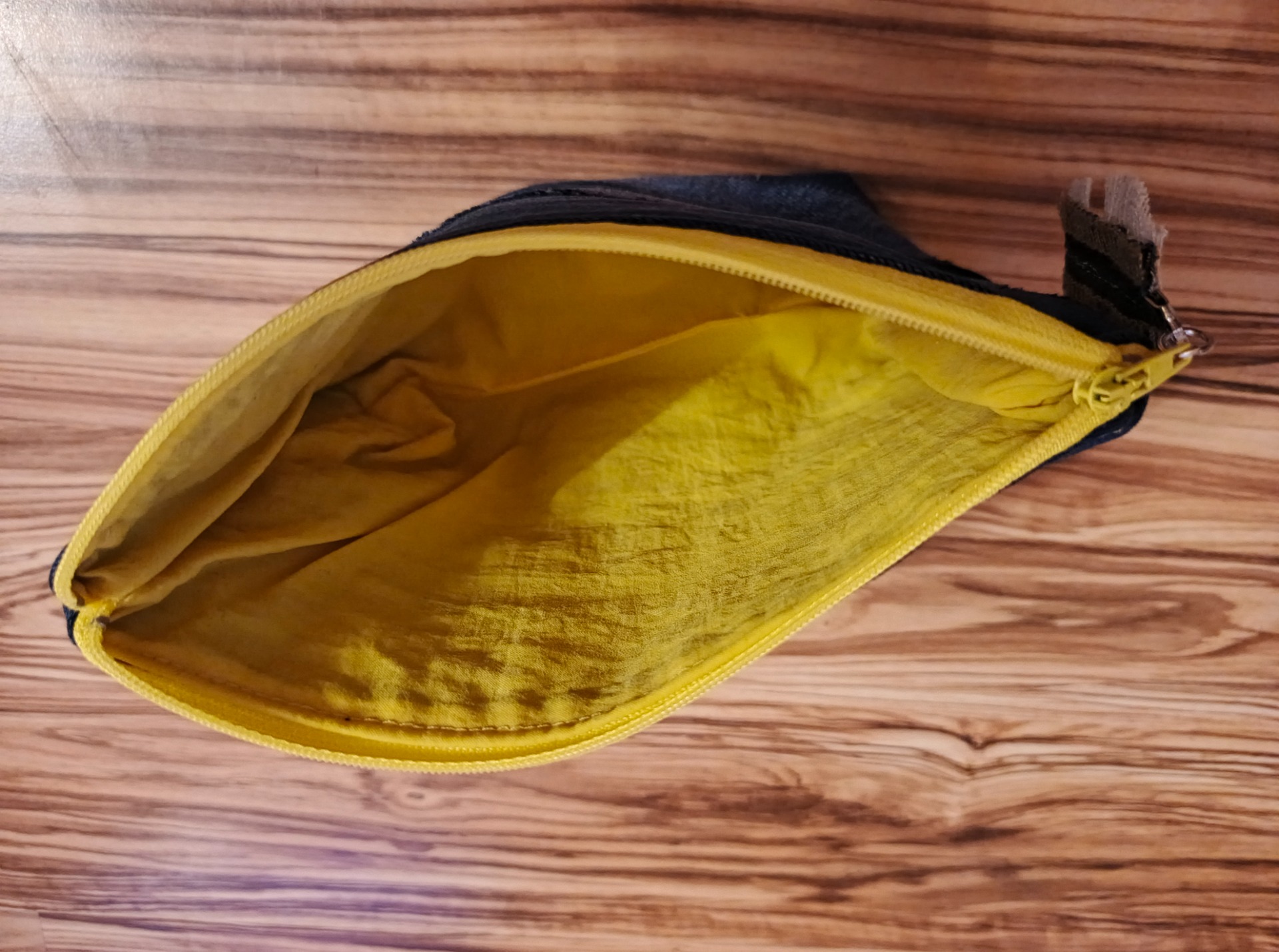 Hravý kontrast: Temně modrý denim zvenku doplňuje zářivě žlutá podšívka uvnitř. Pokaždé, když taštičku otevřete, zlepší vám to náladu!
