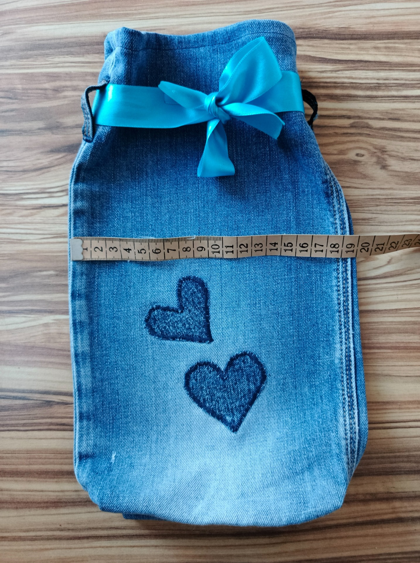 Upcyklovaný vak s modrou stuhou a srdíčky