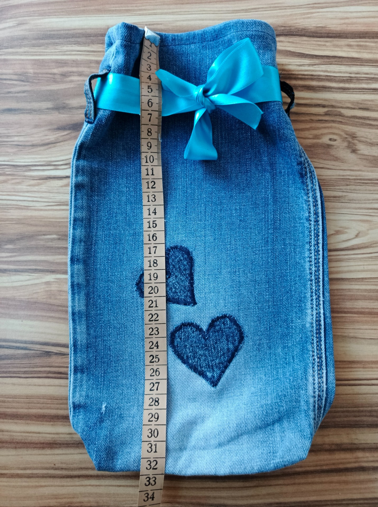• Materiál: Upcyklovaný denim dvou odstínů, saténová/textilní stuha.